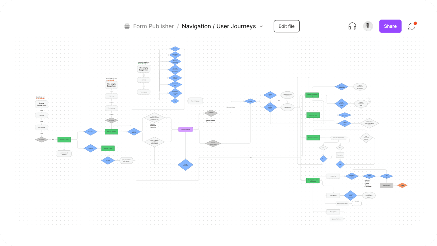 Since I was new to Form Publisher, I had to familiarize myself with the add-on's existing workflow and other touchpoints. I mapped them all out and identified pain points relating to my gathered context.