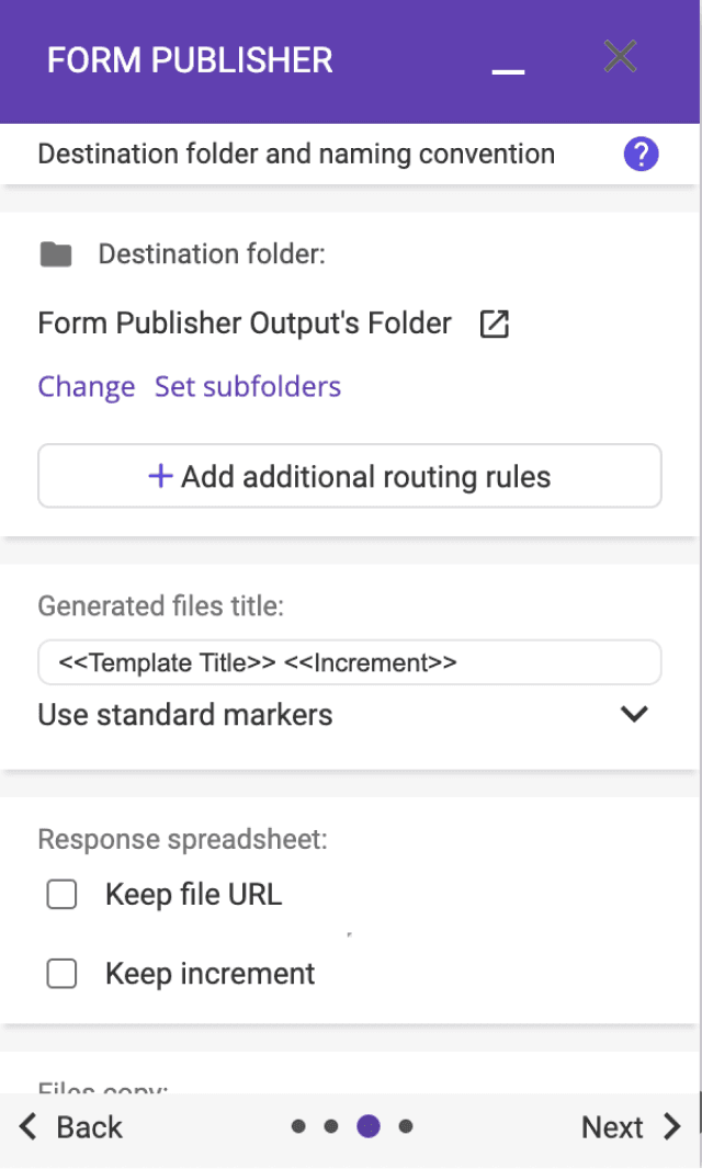 The user has to select the template and go through screens containing additional settings like destination folders, naming conventions, sharing list etc., none of which are mandatory for the file generation process to start.
